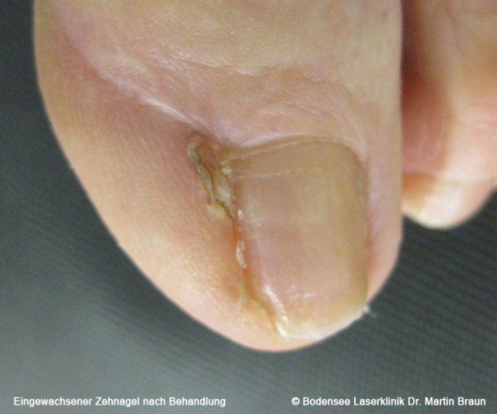 If recurrent inflammation cannot be eliminated by conservative measures, an ingrown toenail should be corrected surgically. Under local anesthesia, part of the nail including the nail bed and the adjacent tissue is removed (Emmert's plastic surgery), which makes the nail narrower and reduces the risk of it growing in again.